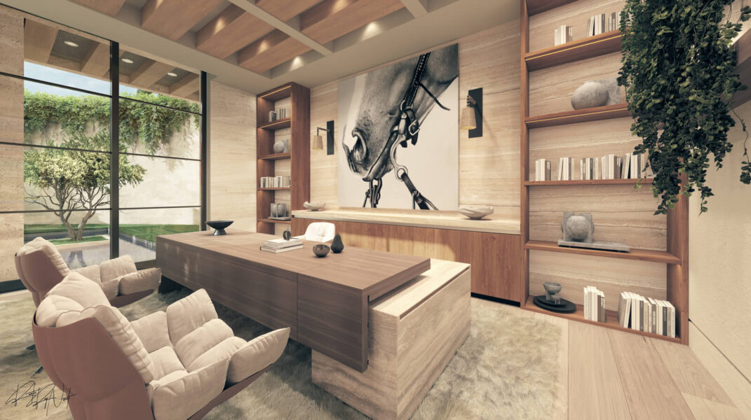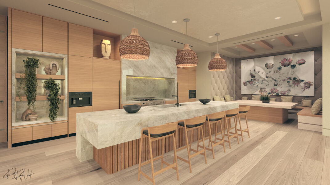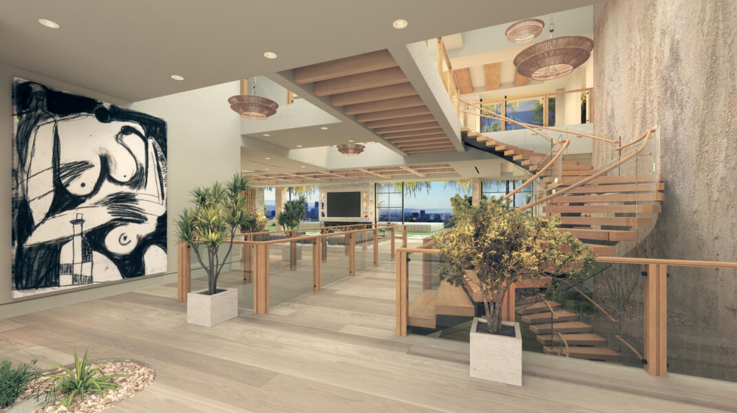 Crafted with natural stone, bespoke woodwork, and walls of travertine, the home’s interiors are a study in texture and light. A 20-foot tree rises through the center of the floating stairwell, a dramatic focal point that underscores the estate’s connection to nature. Throughout, the finishes reflect a commitment to excellence, from hand-chiseled stone countertops to custom lighting and fully integrated smart home features.