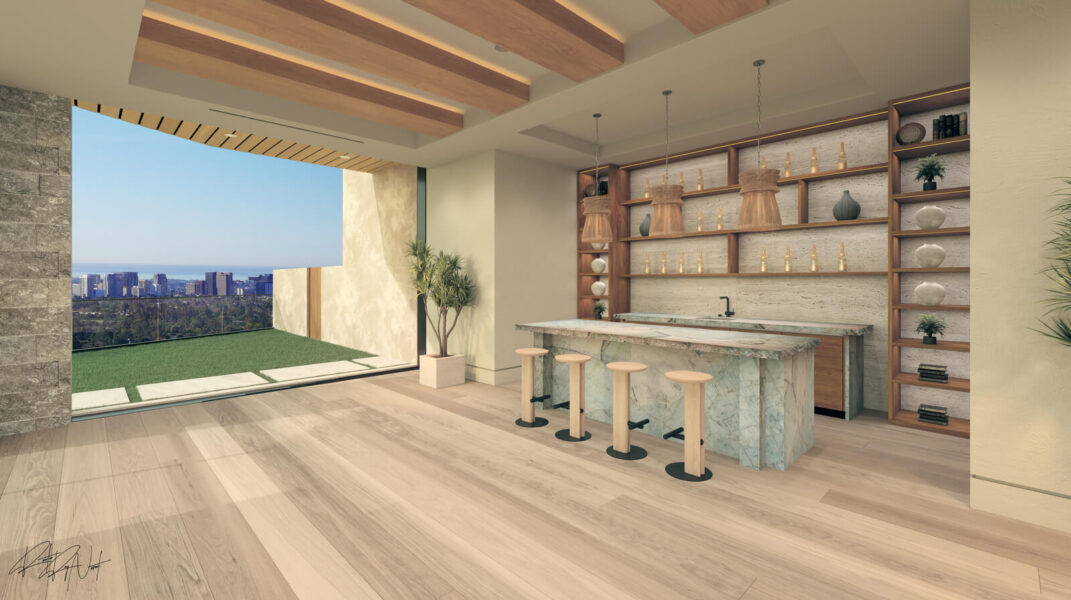 Outside, Opal transforms into a true resort: a glass-bottomed main pool, travertine-wrapped eyebrow pool, cascading waterfalls, organic gardens, and multiple terraces offer extraordinary spaces to relax or entertain—all set against a panoramic backdrop. An indoor-outdoor gym and numerous intimate gathering spaces add to the home’s lifestyle offerings.