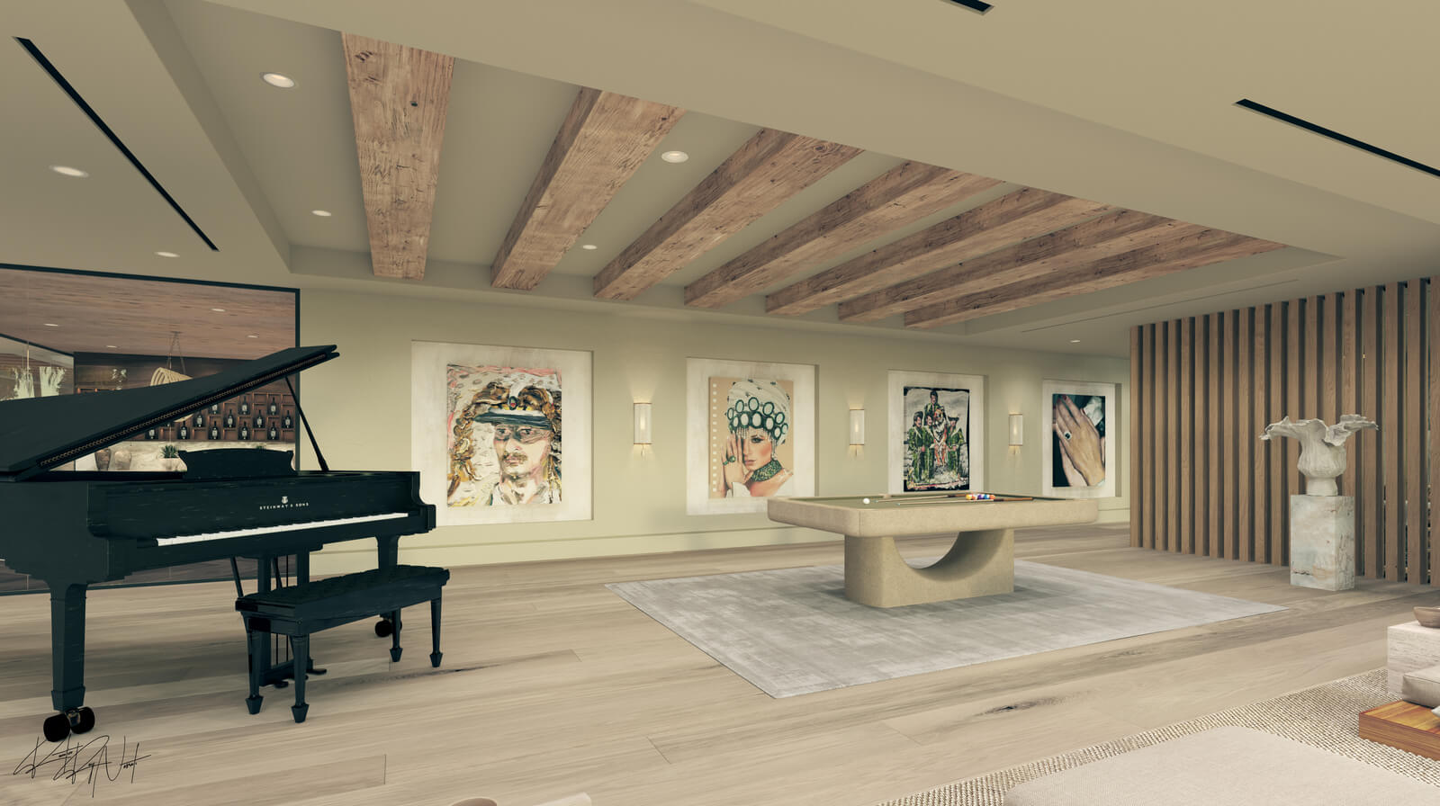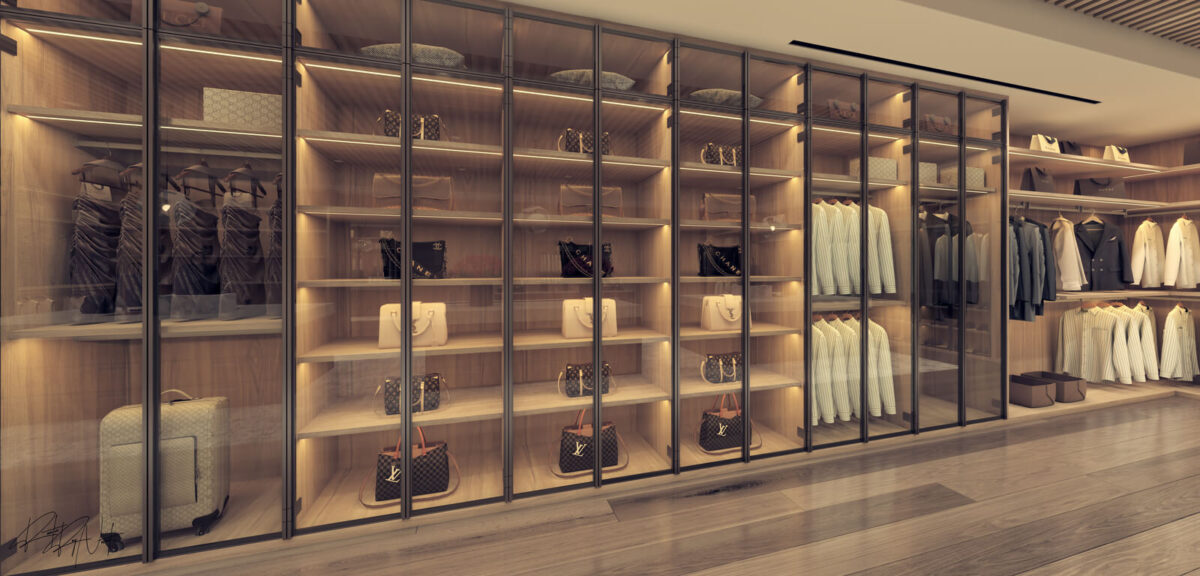 The primary suite spans its own grand wing and includes a spacious lounge and a boutique-style closet that rivals the most exclusive fashion houses. Each of the six bedrooms and eight bathrooms reflects the home’s warm, modern aesthetic. For everyday living and unforgettable entertaining, the home offers a chef’s kitchen plus an additional prep kitchen with a commercial-grade walk-in refrigerator, a suede-wrapped breakfast nook, library, office, wine cellar and tasting room, game room, and a private theater crowned with a fiber-optic starlight ceiling.